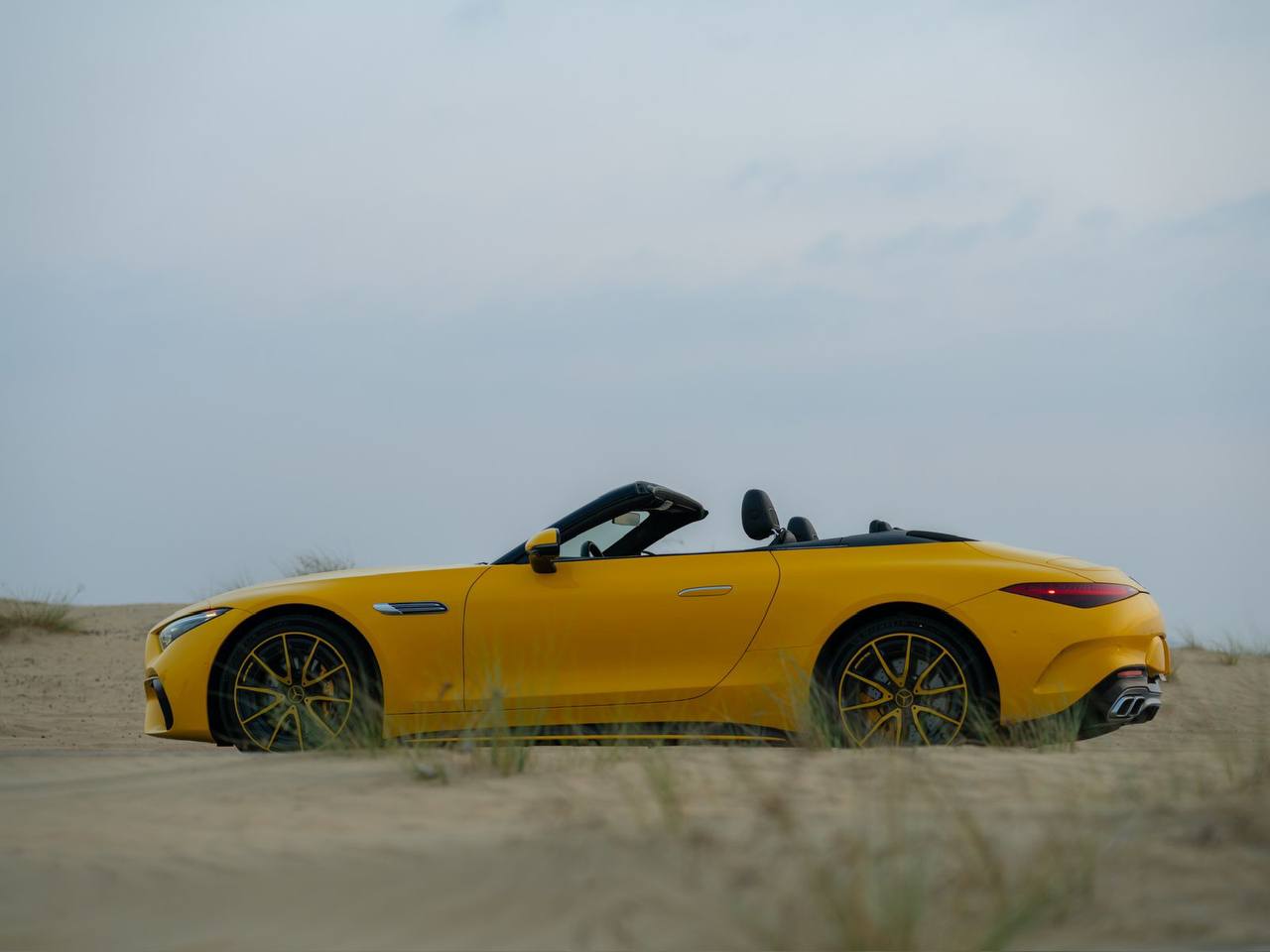 The Mercedes AMG SL63 redefines what an convertible can be. Equipped with a V8 engine it rockets 0–100 km/h in about 3.60. Its aggressive design, sharp lines, and signature Mercedes styling make it a head-turner wherever you go.